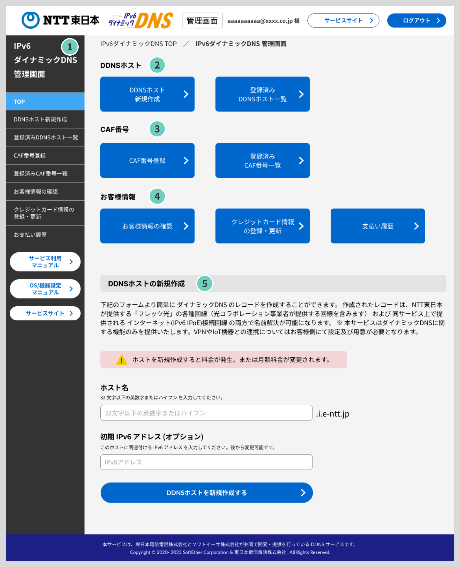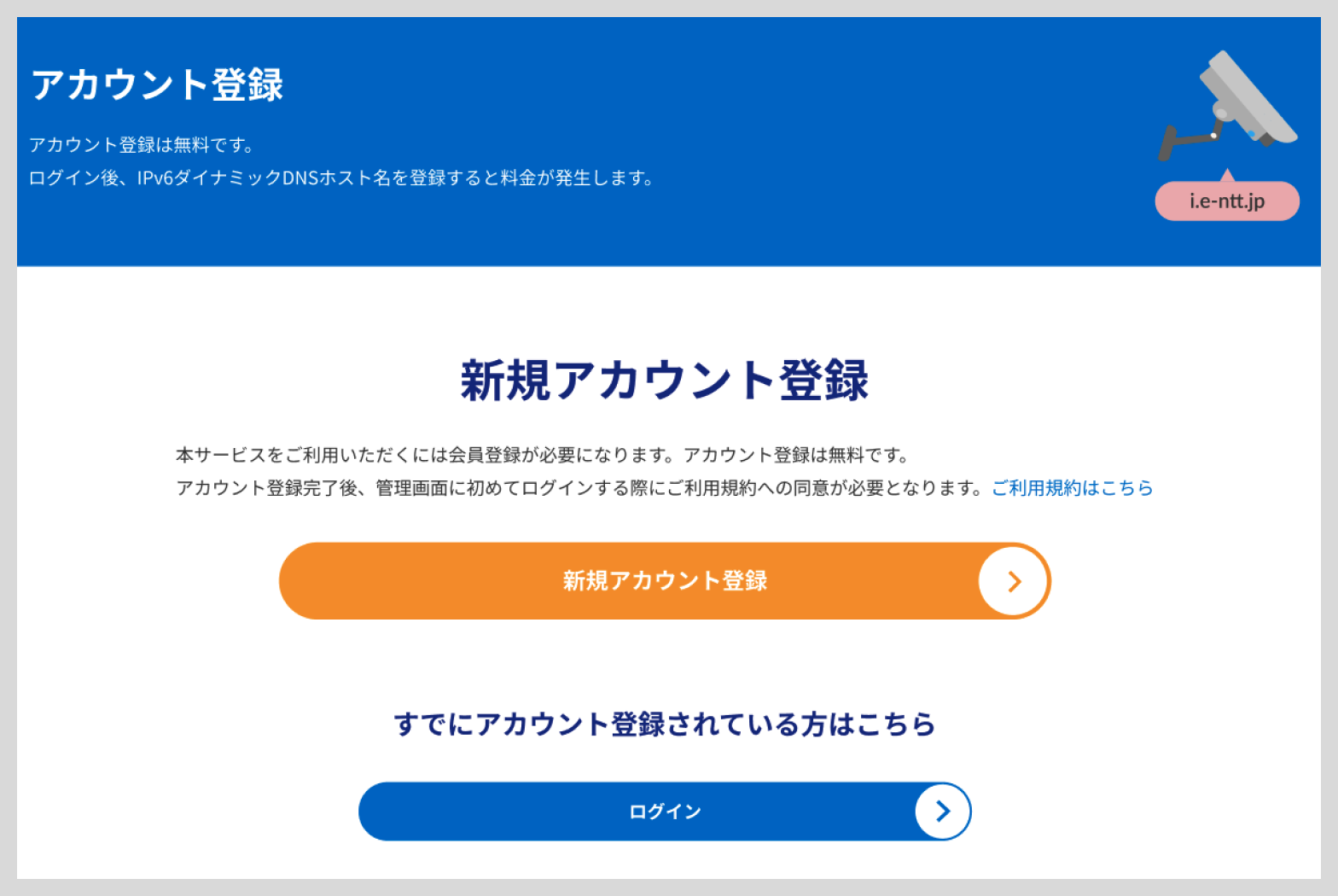 IPv6ダイナミックDNS Webサイト内にある「アカウント登録(無料)」または、「無料でアカウントを登録する」ボタンをクリックしてアカウント登録ページにアクセスしてください。
