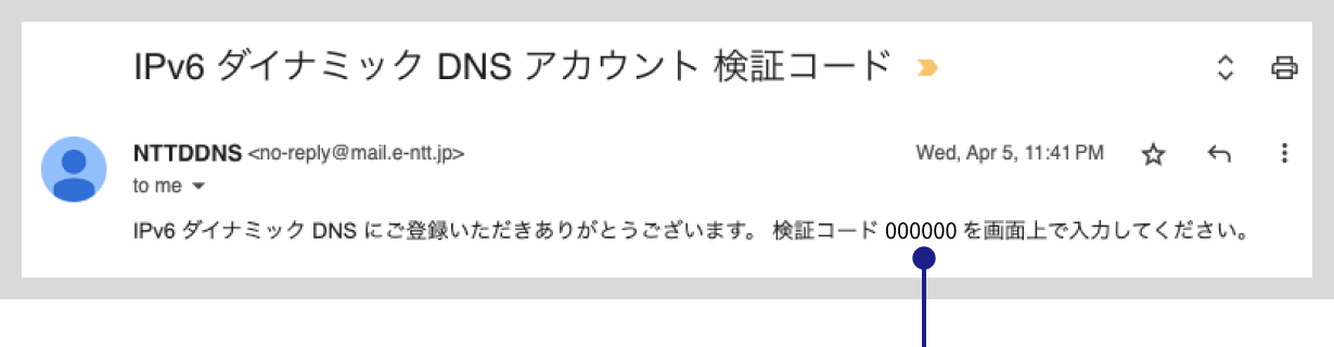 入力したメールアドレス宛に「IPv6 ダイナミック DNS アカウント 検証コード」という件名のメールが送信されるので、メール内に明記された「検証コード」を画面内の「Verification Code」にご入力のうえ「Confirm Account」をクリックしてください。