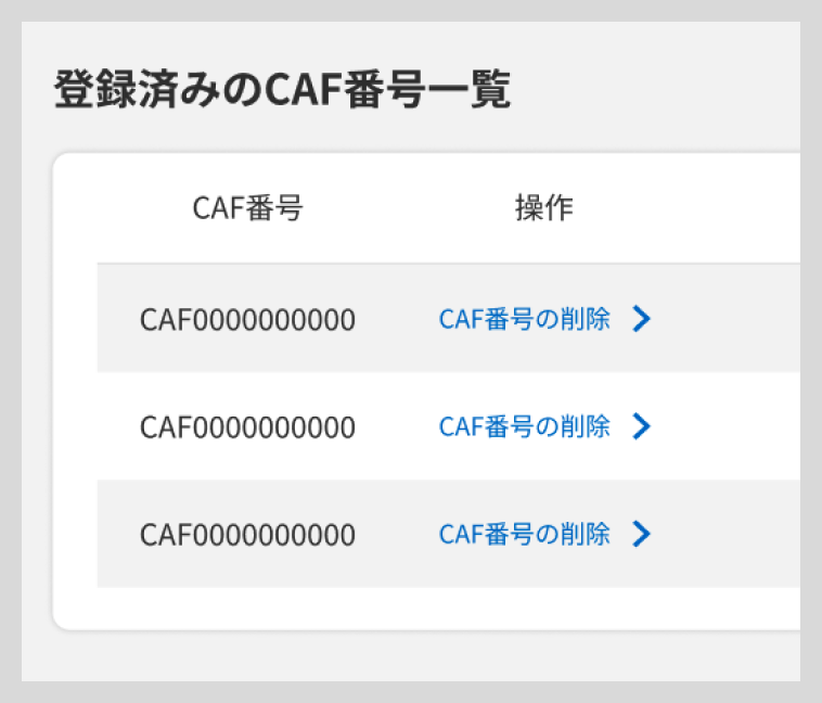 登録済みのCAF番号の一覧が表示されます。削除したいCAF番号の右にある「CAF番号の削除」ボタンをクリックしてください。「削除完了」の画面が表示されれば削除完了です。登録済みCAF番号一覧画面にアクセスし、一覧に削除したCAF番号がないことを確認してください。