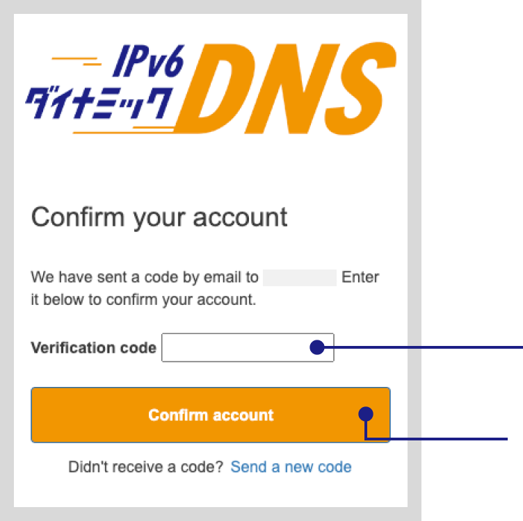 「Sign up」をクリックすると、下図の画面が表示されます。 入力したメールアドレス宛に 「IPv6 ダイナミック DNS アカウント 検証コード」という件名のメールが送信されるので、メール内に明記された「検証コード」を画面内の「Verification Code」にご入力のうえ「Confirm Account」をクリックしてください。